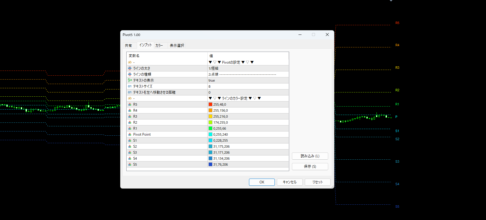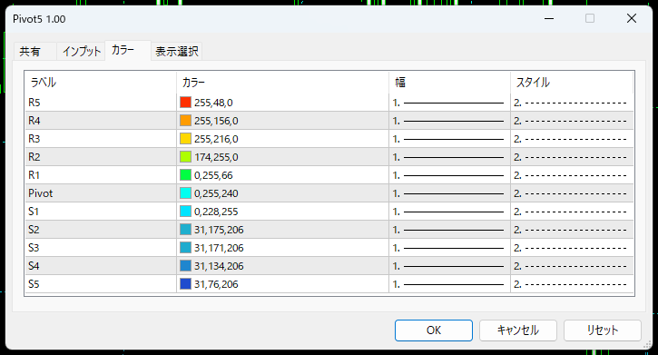 【MT5用】Pivot(ピボット)のレジスタンス、サポートラインをS5~R5まで5本ずつ表示してくれるインジケーター